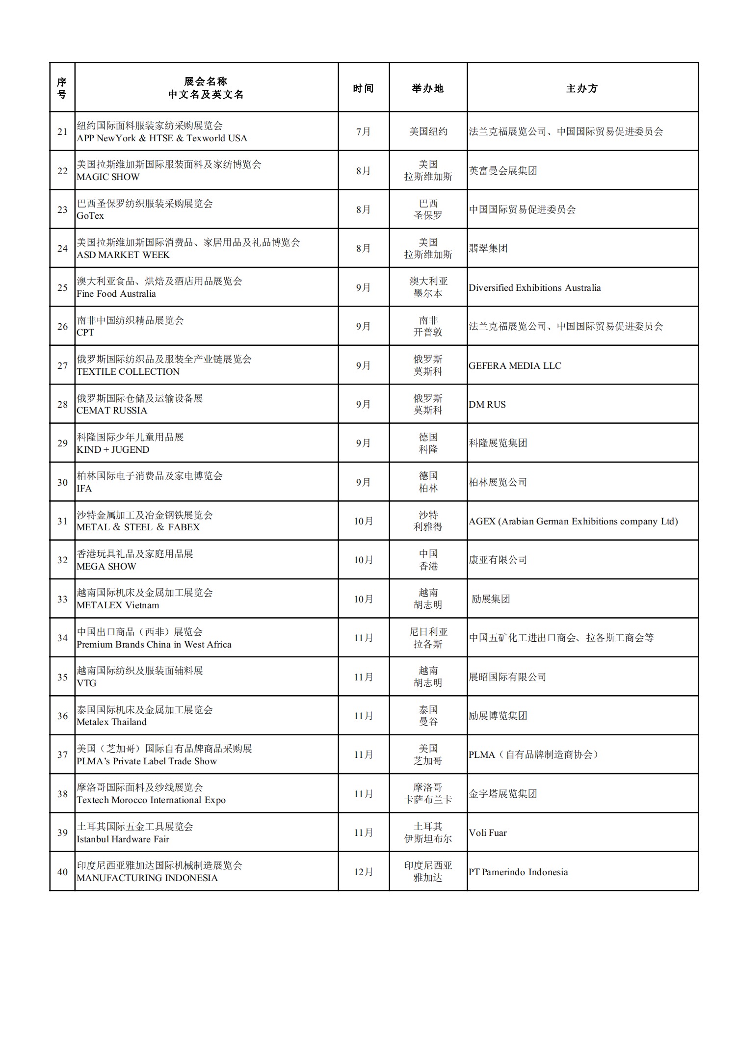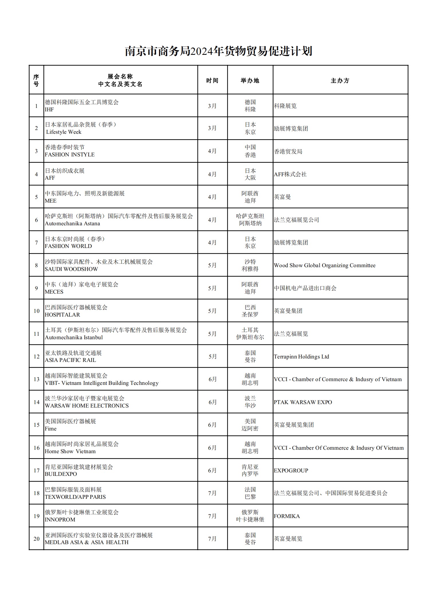为深入贯彻党的二十大精神和省政府、市政府决策部署,落实推动外贸保稳提质系列政策举措,全力支持企业抓订单、拓市场、保份额,南京市商务局按照“服务产业、错位支持”的原则,在江苏省商务厅2024年贸易促进计划的基础上,制定《南京市商务局2024年货物贸易促进计划》,列入境外重点展会40个。