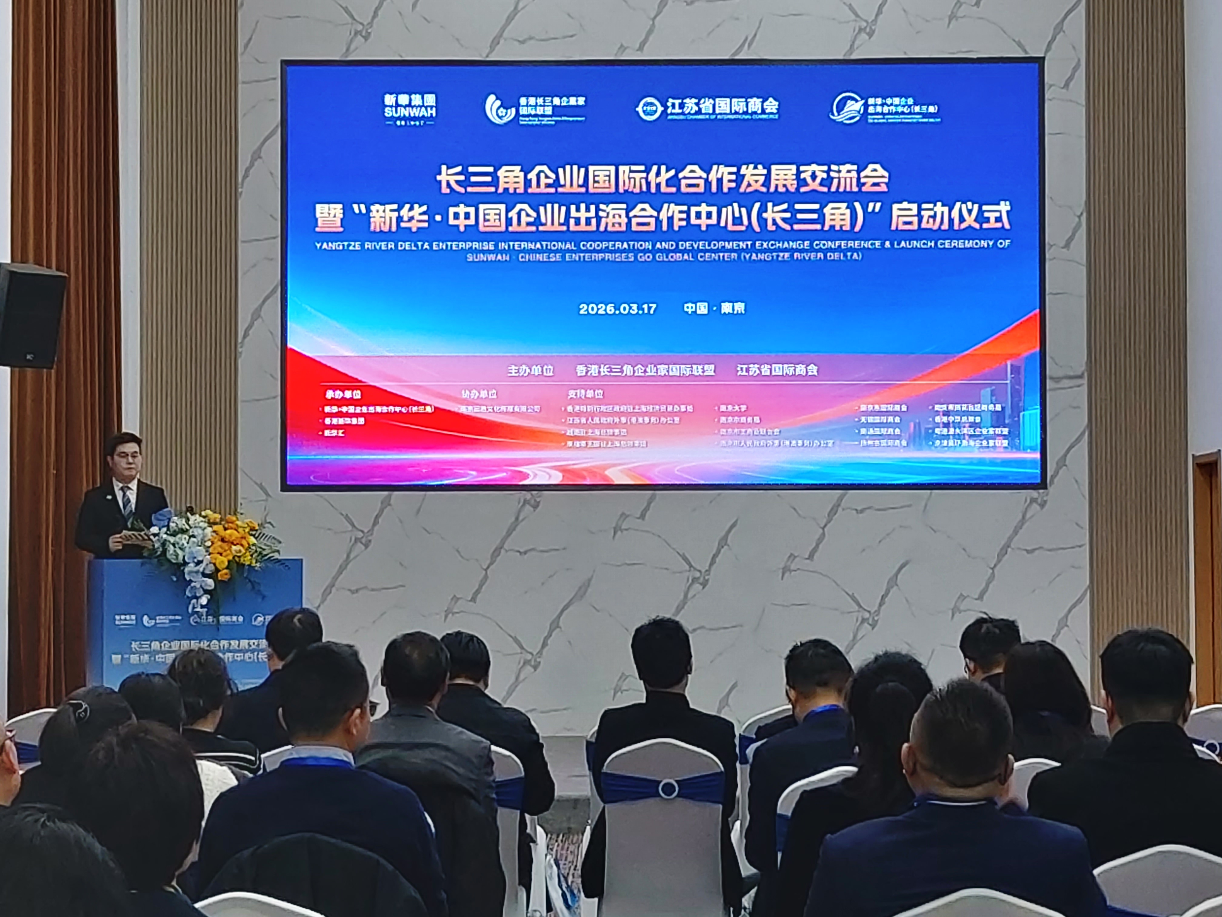 3月17日,由香港长三角企业家国际联盟与江苏省国际商会联合主办的长三角企业国际化合作发展交流会暨“新华·中国企业出海合作中心(长三角)”启动仪式在南京成功举办。全国政协常委、香港长三角企业家国际联盟主席、粤港澳大湾区企业家联盟主席、香港中华总商会会长、香港新华集团主席蔡冠深,越南、柬埔寨王国等海外驻沪总领事,江苏省外办、省贸促会(国际商会)有关领导,南京市外办、市商务局、市投促局、市贸促会(国际商会)及无锡、扬州、南通等地贸促机构代表,南京大学、东南大学、南京理工大学等高校代表,港澳及海内外商协会代表、行业专家、企业家代表约150人出席会议。